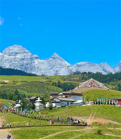 甘海子位于玉龍雪山東麓,原為高山冰蝕湖泊,后因雪線上升,積水減少以至干涸,人稱“干海子”,甘海子是一個三面環山的高原草甸,能夠縱覽玉龍雪山全貌,整個大草甸長約4公里,寬約1.5公里,長滿了茂密的牧草和低矮的灌木林。甘海子是玉龍雪山旅游區的游客集散中心,可為游客提供食、住、游、行、娛、購等服務。這里有世界球道最長、亞洲海拔最高、唯一在雪山腳下的高爾夫球場。